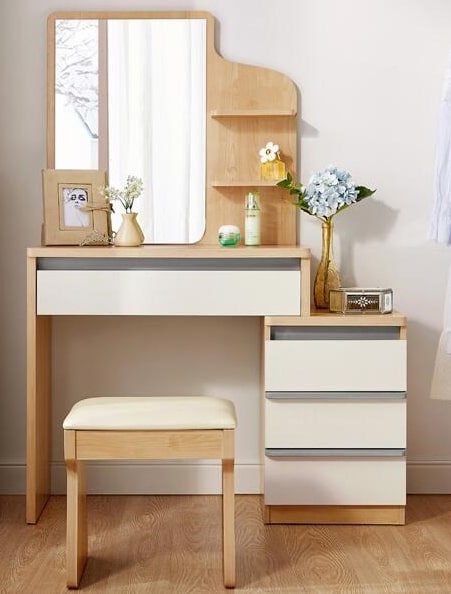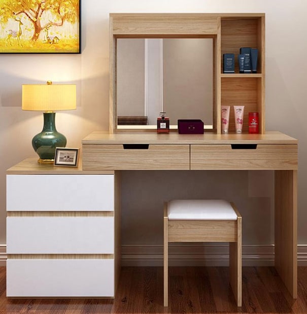 Bàn trang điểm 2 ngăn kéo kèm 1 tủ đi kèm, 1 mặt gương, 1 đôn